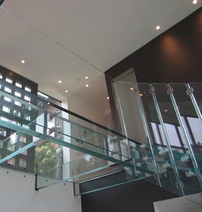 Стеклянные ступени и стеклянная площадка на лестнице